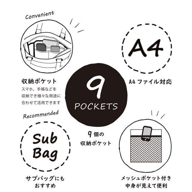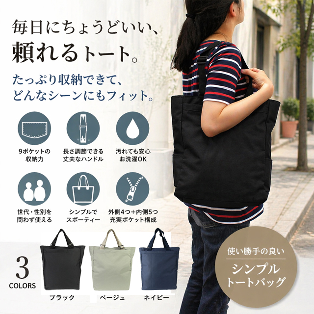 世代問わず使えるたっぷり収納9ポケットのナイロントートバッグ!