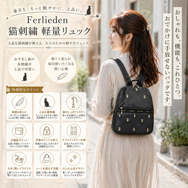 Ferliedenフェアリーデン猫刺繍軽量リュック 女性用 レディース 旅行 ネコ柄 街歩き 女性デイサービスかばん Dパック型リュック バッグ カバン 鞄 軽い 多機能ポケット付き ボンディング素材 背面ファスナー 盗難防止ファスナー付き 母の日 敬老の日