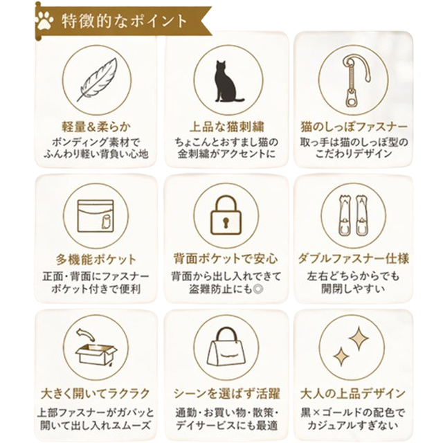 猫の刺繍がちりばめられた軽量柔らか上品リュック!