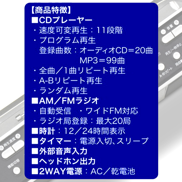 | 仕様 | ■セット内容:本体、ACアダプタ、取扱説明書(保証書付) 【本体】 ■電源:AC100V 50/60Hz 出力=DC9V 1A、、乾電池DC9V(単2形×6個使用) ■電池持続時間:CDプレーヤー:7時間、AM/FMラジオ:12時間 ※各モードで消費電力が異なるため、使用条件により誤差が生じます。 ■消費電力:15 W ■入力端子:音声:O3.5mm ステレオミニ ■出力端子:イヤホン:O3.5mm ステレオミニ ■内蔵スピーカー:1W + 1W、ユニットサイズ:6.5 cm、再生方式:ステレオ ■機能:時計:12/24時間表示切替、タイマー:電源入切、スリープ ■サイズ:約幅:304 × 高:165 × 奥:95mm ■質量:約1.0 kg ※乾電池含まず ■材質:ABS樹脂、PVC 【CDプレーヤー】 ■対応ディスク:オーディオCD、CD-R/RW ■対応ファイルフォーマット:CD-DA、MP3、WMA ■再生機能:速度可変再生:11段階、プログラム再生: 登録可能曲数(最大)=オーディオCD 20曲/MP3 99曲、 全曲/1曲リピート再生、A-Bリピート再生、ランダム再生 【ラジオ】 ■ラジオ受信周波数:FM:76.0-108.0MHz(ワイドFM対応)、AM:522-1620kHz ■ラジオ機能:自動選局、手動選局、ラジオ局登録(最大20局) ■ラジオアンテナ:FM:ロッドアンテナ、AM:内蔵フェライトバーアンテナ 【ACアダプタ】 ■定格:入力:AC100-240V 50/60Hz 0.65A、出力:DC9V 1A ■コード長:約1500mm |