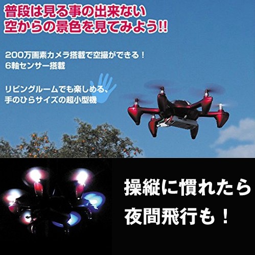 ■セット内容:本体、充電式リチウムポリマー電池(2個)、USB充電器、2.4GHz 4ch送信機、プロペラガード1セット、予備プロペラ1セット、取扱説明書