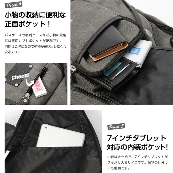 ケミカルウォッシュ加工を施した帆布生地はヴィンテージ感抜群な仕上がり! カブセのついたジッパー付きポケットや、正面左下部ポケットは見た目と違いかなりの収納力があるのもポイント。