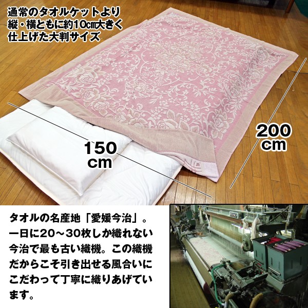 従来のタオルケットに比べて、縦・横ともに10cm大きく仕上げたゆったりの大判サイズ仕上げです。