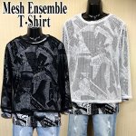 メッシュアンサンブルTシャツ(メンズ,アンサンブルセット,長袖,ロングTシャツ,プリントロンT,メッシュアウター,重ね着,モノトーン)