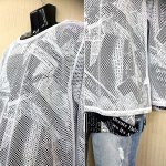 ニュースペーパー柄のプリントインナーと合わせて白もしくは黒のメッシュアウターを重ね着するだけ。