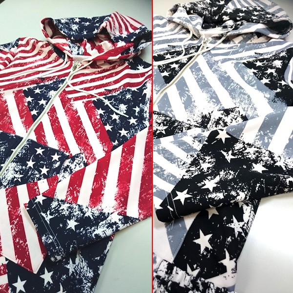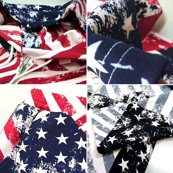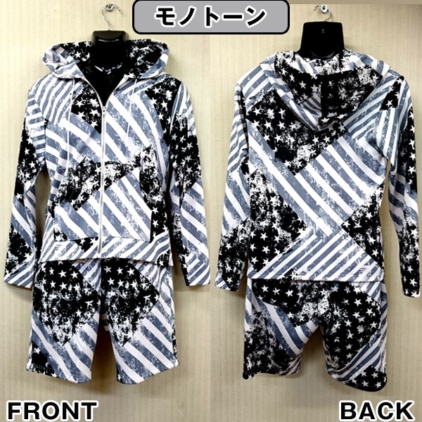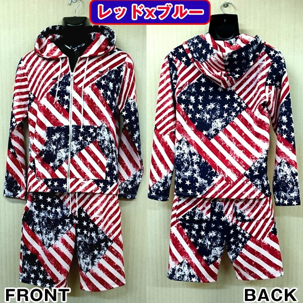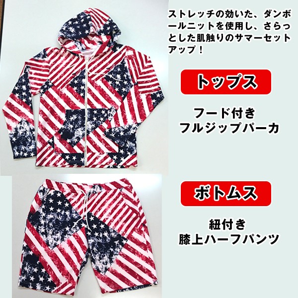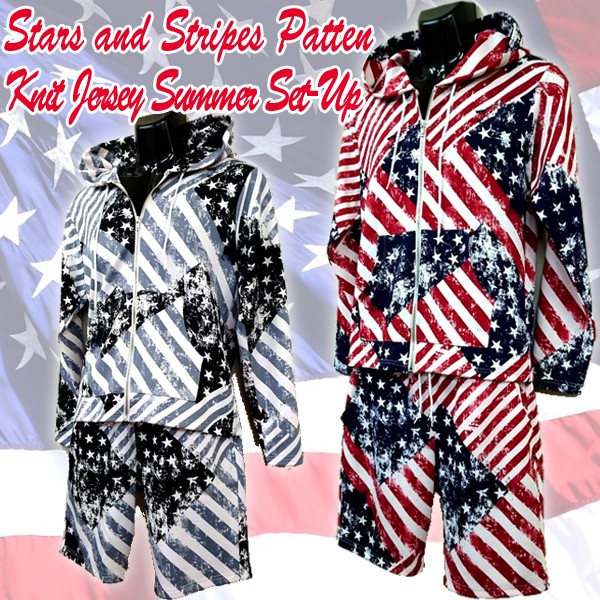 星条旗柄ニットジャージセットアップ(上下セット,RINGS,メンズ,サマーセットアップ,ハーフパンツ,長袖,パーカー,アメリカ国旗柄,ストレッチ) [RNG-117008]