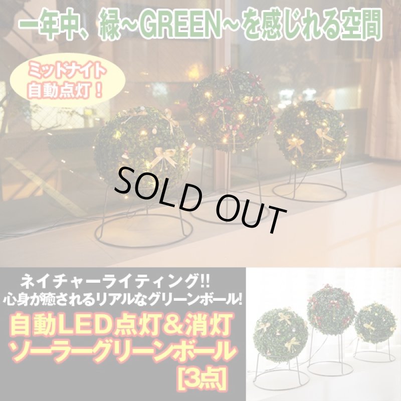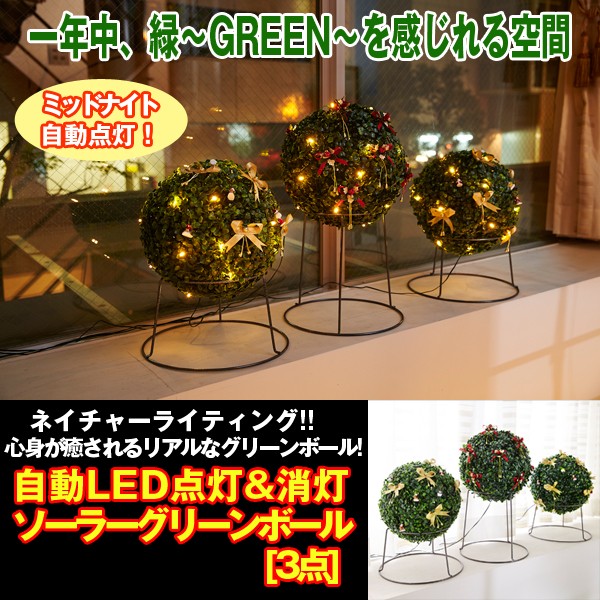 自動LED点灯&消灯ソーラーグリーンボール[3点] (LEDイルミネーションライト,観葉植物,緑,グリーン,充電,防滴仕様,ライティング)