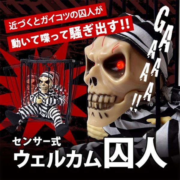 人を感知すると、センサーが反応し、髑髏囚人が柵を揺らし、目を赤く光らせ叫び出す、鉄柵をひん曲げ、顔を突き出すホーンテッド痛快アクションホラー(?)ギミック作動!