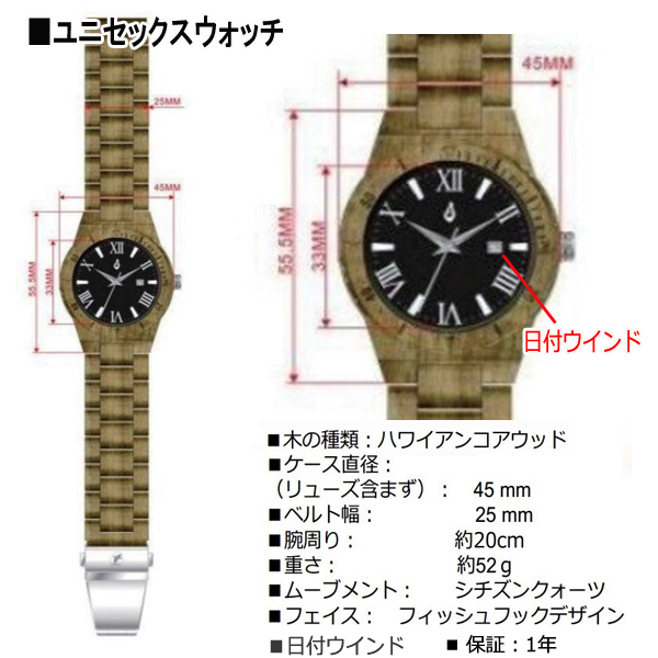 仕様 ■ユニセックスウォッチ ■ケースサイズ:45 mm ■ベルト幅:25 mm ■腕周り:約20cm ■重さ:約52g ■素材:ハワイアンコアウッド(天然木) ■ムーブメント:シチズンクォーツ ■フェイス:フィッシュフックデザイン ■仕様:日付表示ウインド、非防水(ベルトは天然木なので水没にはご注意下さい。) ■保証:1年(※ムーブメントのみの保証です。)