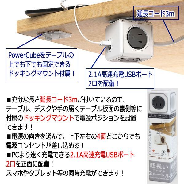 パワーキューブ「延長コード3mUSB」(差込口x4・USBx2)