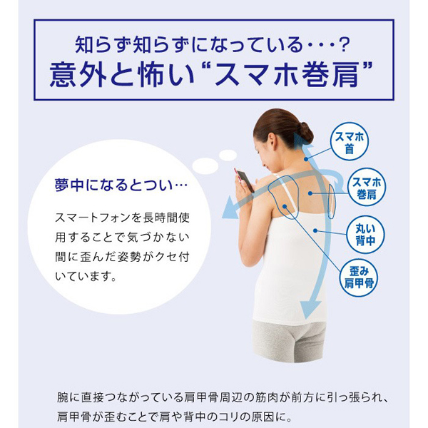 スマホ・PC等による1日の姿勢の固まり、コリ、疲労感を肩甲骨と背筋に大型押圧突起