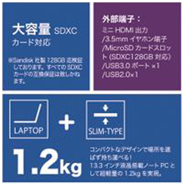 | 仕様 | ■本体サイズ:約幅320×奥211×高13.5mm ■本体重量:約1.2kg ■OS:Windows10 ■プロセッサ:Intel Celeron N4000 ■メモリ:4GB ■ストレージ:32GB ■液晶モニター:13.3インチ(1920x1080 FHD) ■カメラ画素数:200万 ■インターネット接続:Wi-Fi(2.4G/5.0G) ■外部端子:ミニHDMI出力、3.5mmイヤホン端子、MicroSDカードスロット、 USB3.0/2.0ポート ■内蔵バッテリー:7.4V/4600mAh(連続駆動約4時間) ■電源:DC12V 2A(ACアダプター付属) ■付属品:専用ACアダプター、USB/LANポート変換アダプター、取扱説明書 ■メーカー:(株)サイエルインターナショナル ■保証:1年 |