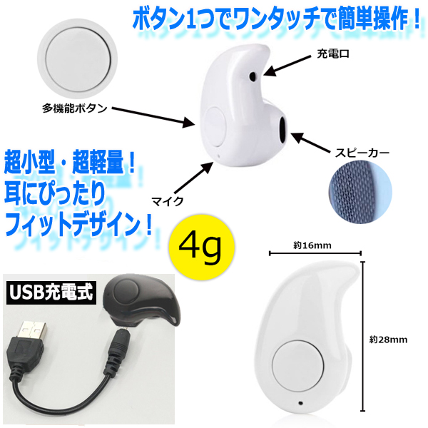 | 仕様 | ■サイズ:約縦28x横16x厚18mm ■重さ:約4g ■素材:ABS ■電源:USB充電式 ■Bluetooth:4.1+EDR ■充電時間:約2時間 ■連続使用時間:約2時間 ■通信範囲:約10m ■操作/機能:通話・電話拒否・リダイヤル・音楽再生/停止 ■仕様:右耳専用(1個入り)、技適マーク取得 ■付属品:充電用USBケーブル ■色:【ブラック】【ブルー】【ホワイト】【ピンク】 |